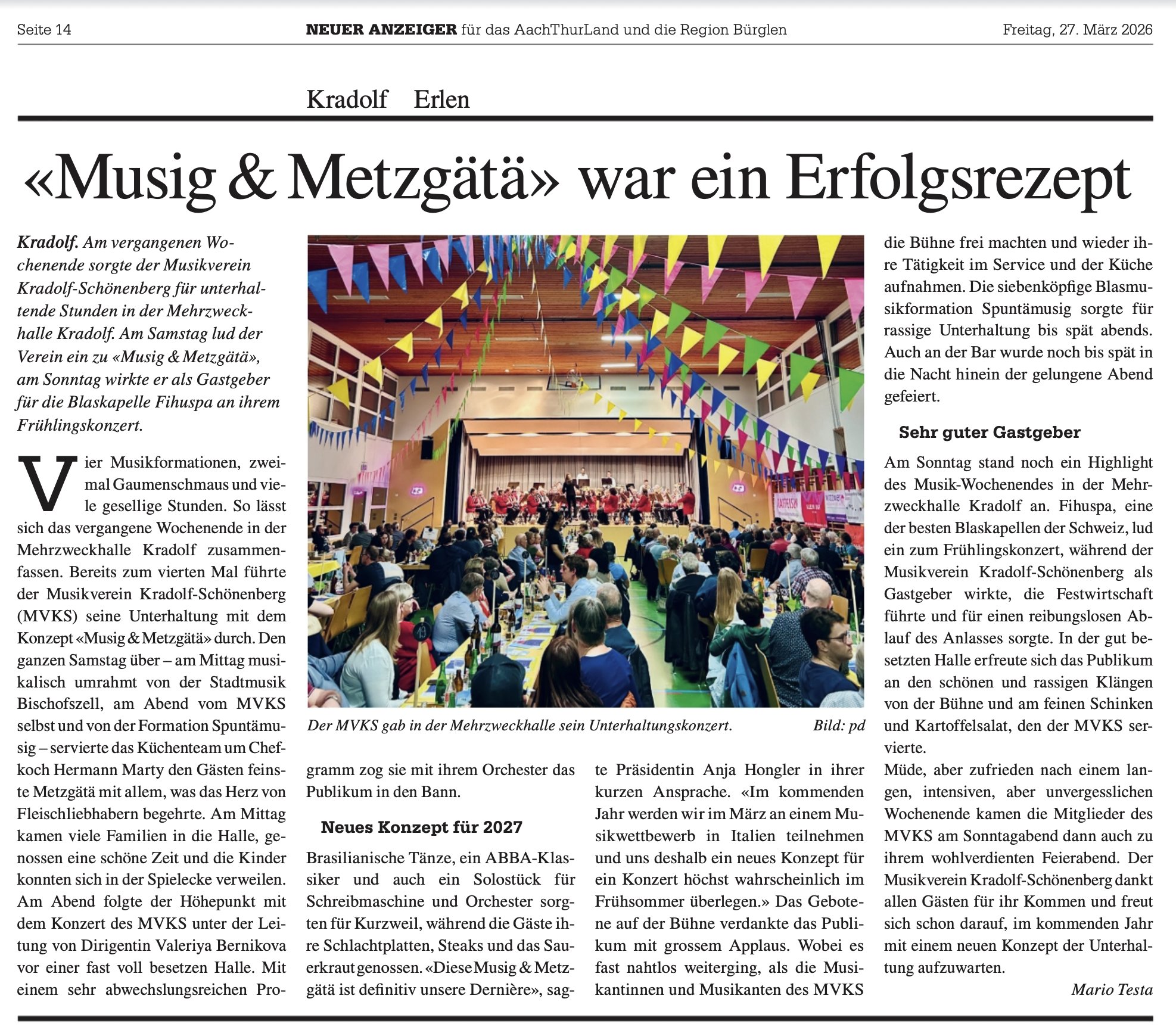 Am 22. März hat der Musikverein Kradolf-Schönenberg seine Musig&Metzgätzä erfolgreich in der Mehrzweckhalle Kradolf durchgeführt. Vom Mittag bis spät in die Nacht lockten Musik und Gaumenfreuden mehrere Hundert Gäste an die Unerhaltung. Nach dem durchschlagenden Erfolg strebt der Verein eine erneute Durchführung einer Musig&Metzgätä mit Chefkoch Hermann Marty im März 2026 an.